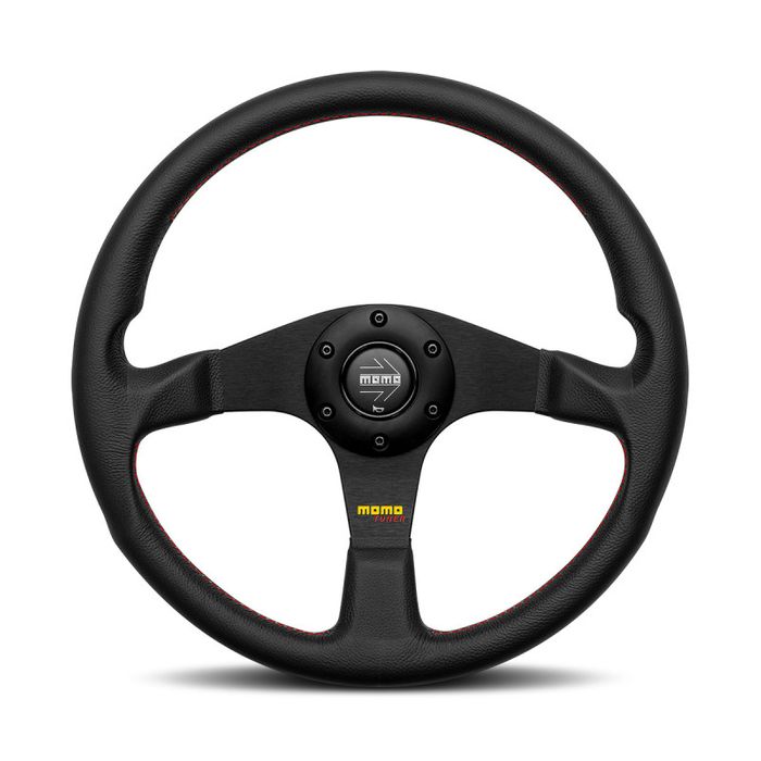 Features include a full leather rim, black aluminium spokes, black centre ring, black MOMO horn button, and contrasting red stitching that gives the MOMO Tuner steering wheel that extra sporty style