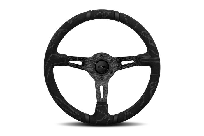 The Momo Ultra Black Edition is a steering wheel which takes it's styling from popular competition steering wheels. The Motorsport theme is continued on the microfibre trimmed rim which features prints of famous motors racing circuits. The aluminium 3 spoke centre has slotted cutouts and a 'stickerbomb' effect of the Momo brand logo.
