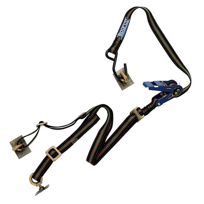 Sparco's Spare Wheel Tie Down Strap is designed to allow the spare wheel to be strapped onto the car. The strap has two loops and one solid hook fitting, comes with three sets of eyebolts and fixing plates.