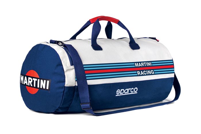 The Martini racing sport bag from Sparco is manufactured from a durable and waterproof polyester material with an adjustable shoulder strap with durable webbing. Featuring Martini racing logos and stripes down the side of the back and at the end.