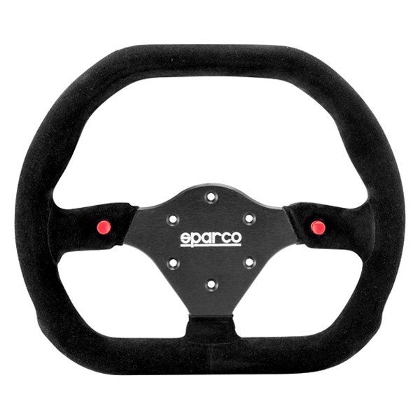 The Sparco 310 steering wheel is a 310mm diameter, 3 spoke flat steering wheel trimmed in black suede with an anatomical design and Sparco logo. It has a flat top and bottom design, and features 2 wheel mounting buttons which are ideal for Gear shifts, drink systems or lap timers etc. It is a competition steering wheel designed for use in saloon racing or rally cars. Fits all standard Momo, OMP, and Sparco type boss kits.