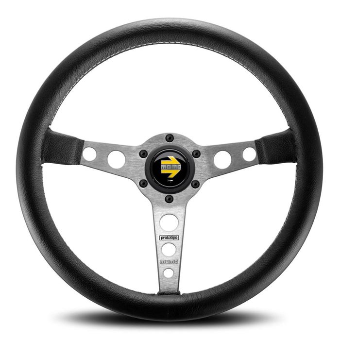 Prototipo is the ideal choice for classic vehicles of all generations. At 350 mm diameter, the unique, timeless design is the perfect choice for both long driving trips or a performance GT car. The iconic holes in your choice of black or silver spokes make this black leather-gripped steering wheel lighter to handle. The hand-sewn parallel white stitching runs the parimeter of the entire steering wheel. The laser-engraved “”Prototipo”” on the spokes and yellow MOMO logo on the embossed horn button provide the ultimate finishing details of this classic MOMO steering wheel.