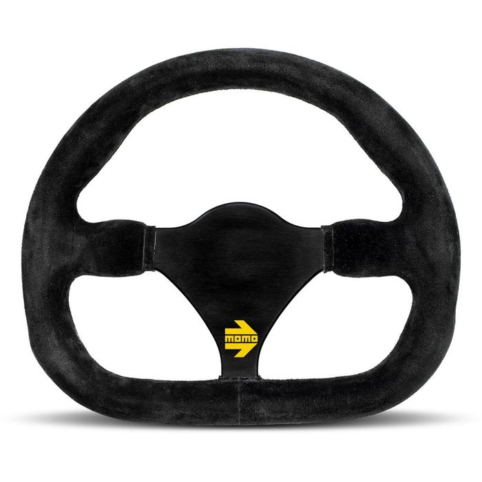 The MOMO MOD.27 racing steering wheel is designed for use in single seater formula cars or kit cars. The flat bottom allows for easier access in the cockpit. Finished in quality black suede, the steering wheel features black aluminium spokes, embossed with the yellow MOMO logo and an undrilled centre section. Like all MOMO steering wheels, the MOD.27 is produced in Italy to the highest quality with an anticorodal aluminium frame. The suede is glued to the rim, instead of being stitched, to provide a seamless finish for greater comfort and durability.