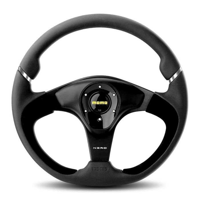 he MOMO Nero steering wheel offers a sleek modern design blended with a combination of the finest premium materials. Featuring a full leather rim with alcantara inserts on the grip, black aluminium spokes, a gloss and satin black centre pad with matching gloss black MOMO horn button, and satin silver detailing rings on the rim, the MOMO Nero steering wheel is worthy of its proven popularity. Like all MOMO steering wheels the Nero is made in Italy from the highest quality materials.