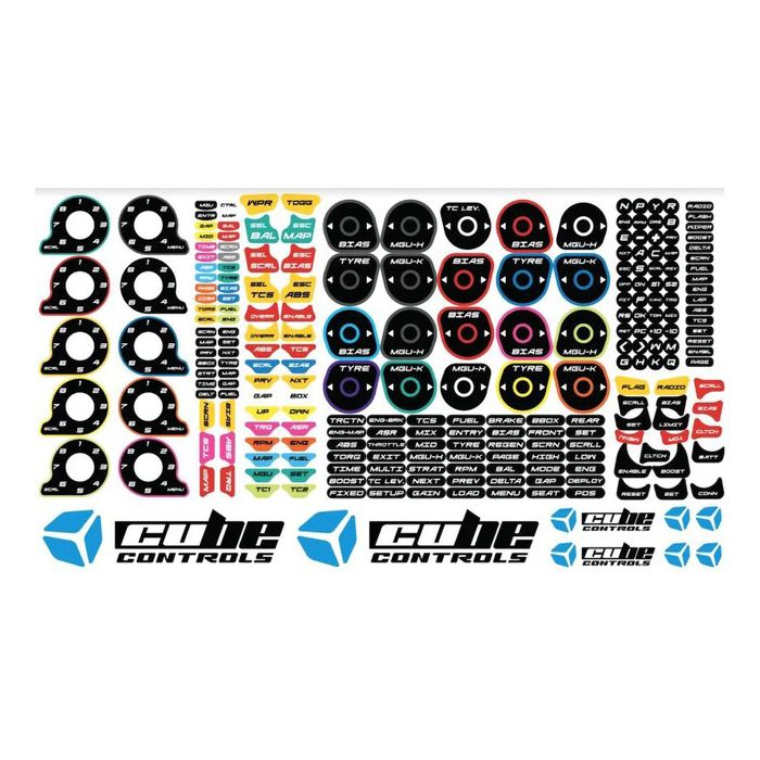 This sticker sheet from Cube Controls allows you to personalise your Sim steering wheels controls. The sheet includes labels for all controls with most having various colour options to allow for an easier visual reference.