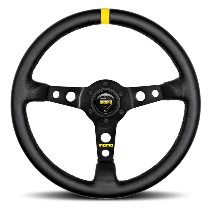 The MOMO MOD.07 racing steering wheel is designed for use in saloon and rally cars with the deep dish offering the driver maximum control and the yellow leather marker at the top of the wheel providing a quick reference to the position of the steering. Finished in quality black leather, the steering wheel features three black aluminium spokes and the MOMO Italy logo on the horn button. Like all MOMO steering wheels, the MOD.07 is produced in Italy to the highest quality with an anticorodal aluminium frame. The leather is glued to the rim, instead of being stitched, to provide a seamless finish for greater comfort and durability