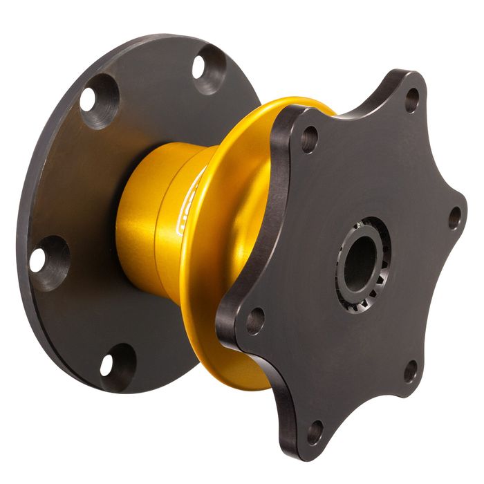 Racetech 6 bolt Group N type quick release hub kit, supplied with a bolt on splined pin, which bolts onto your aftermarket boss kit (OMP, Momo etc). The fitting of this kit between your boss kit and your steering wheel enables you to remove your steering wheel and doesn't require the welding in of a splined slug, but remember it does bring the steering wheel 60mm nearer to the driver. If you don't want the steering wheel closer, you could consider changing to a flat wheel if your current model is dished. These top quality quick release units are precision machined to ensure no play in the splined coupling and the master spline ensures quick error free location and reliable longevity. The sliding release secion is anodised in the bright gold colour which meets the FIA requirements.