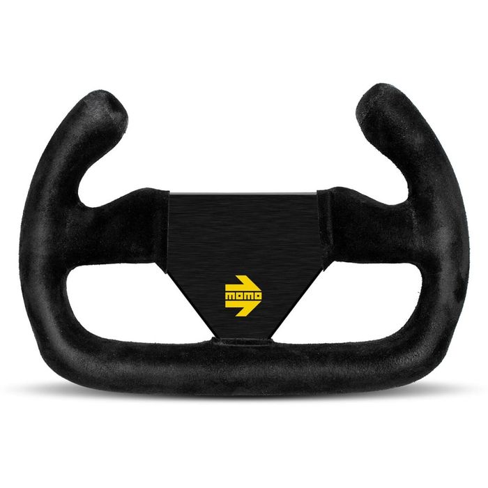 The MOMO MOD.12/C racing steering wheel is designed for use in single seater formula cars. The flat bottom allows for easier access in the cockpit and the cut-out top section provides greater visibility of the dashboard and gauges. Finished in quality black suede, the steering wheel features black aluminium spokes, embossed with the yellow MOMO logo and an undrilled centre section. Like all MOMO steering wheels, the MOD.12/C is produced in Italy to the highest quality with an anticorodal aluminium frame. The suede is glued to the rim, instead of being stitched, to provide a seamless finish for greater comfort and durability.